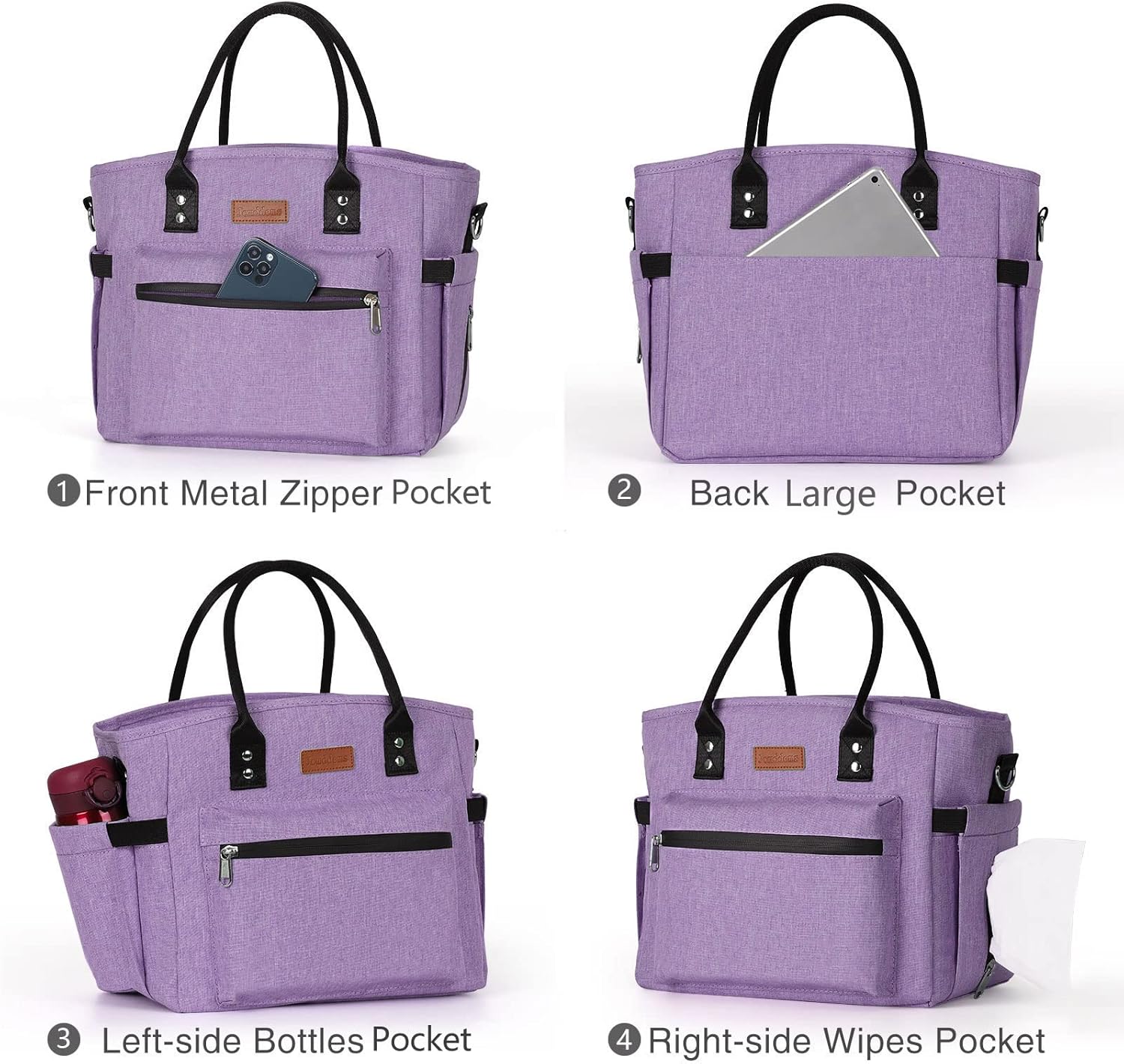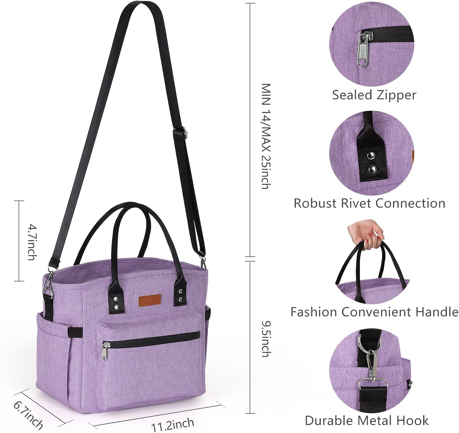 【LARGE CAPACITY & MULTI POCKETS】lunch bag Measures 11.2 x 6.7 x 9.5 inch.1 main zipped compartment,1 front zippered pocket, 1 back large pocket and 2 side pockets, The main zipped pocket can put your food and snacks you need whole day,front zippered pocket and back large pocket are perfect to store your phone, phone charger, wallet, bus card ect,The two side pockets for your bottle,umbrella,tissue.ect