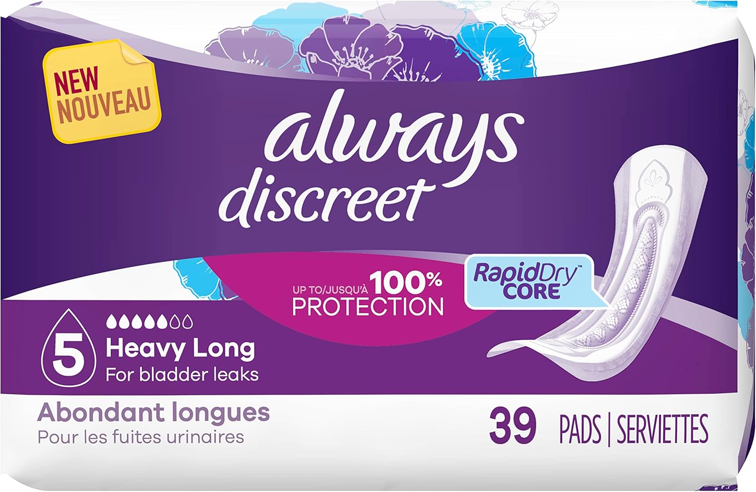 Always Discreet Incontinence Pads for Women, Heavy Absorbency, Long Length, 39 Count