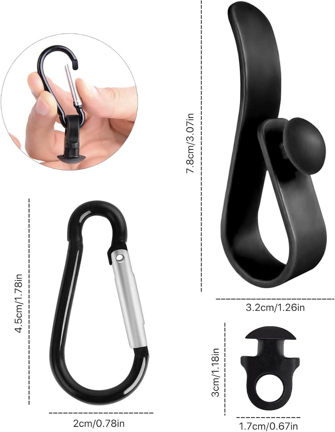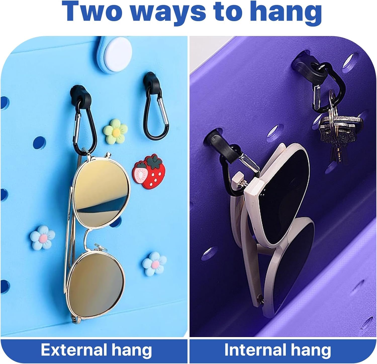 Two ways to use and Packages inclued : This carabiner clip can be used on the Inside or outside of the bogg bag, keeping things secure and handy.The items include 2 key holders,2 hooks and 4 fixators