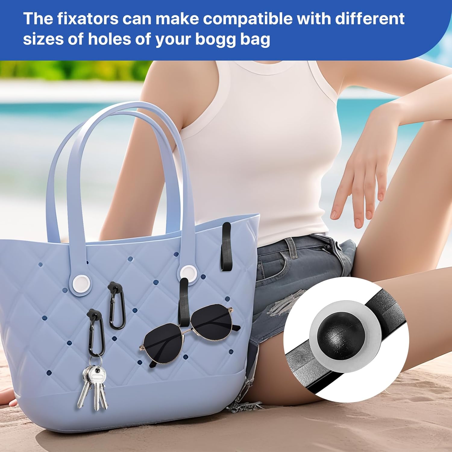 Additional 4 Fixators:In order not to getting loose when hooking or inserting,we specially send 4 silicone fixators. Also,the fixators can make the key chain and hooks compatible with different sizes of holes of your bogg bag while making no harm to the holes during the process of hooking.