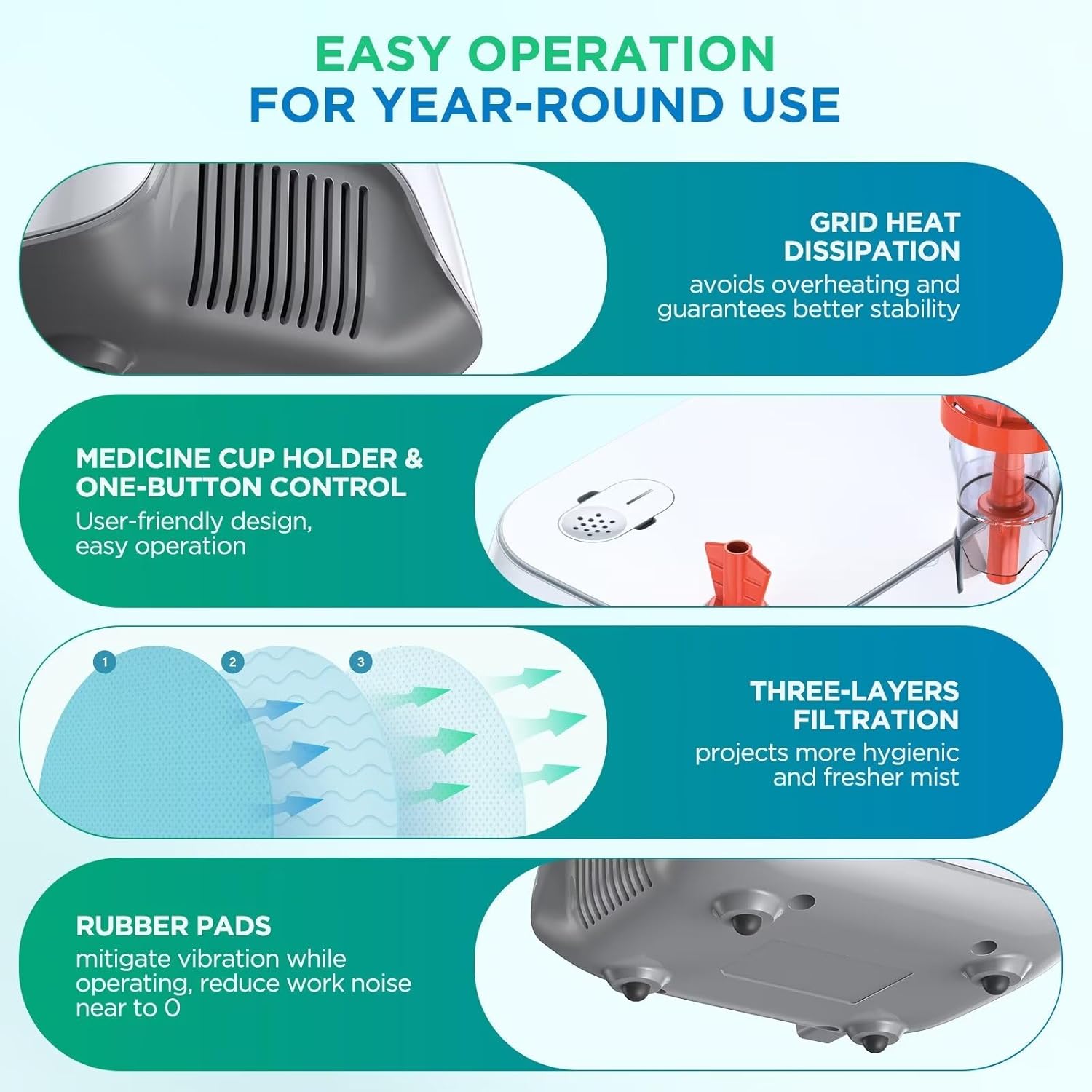 [Exclusive Home Nebulization Design] Our jet nebulizer equips anti-slip pads at the device’s bottom to enable shock absorption and noise reduction, lowering operational volume down to 50dB. Compact & portable design with a medicine cup holder to liberate hassled nebulization routine and provide seamless care for your respiratory health.
