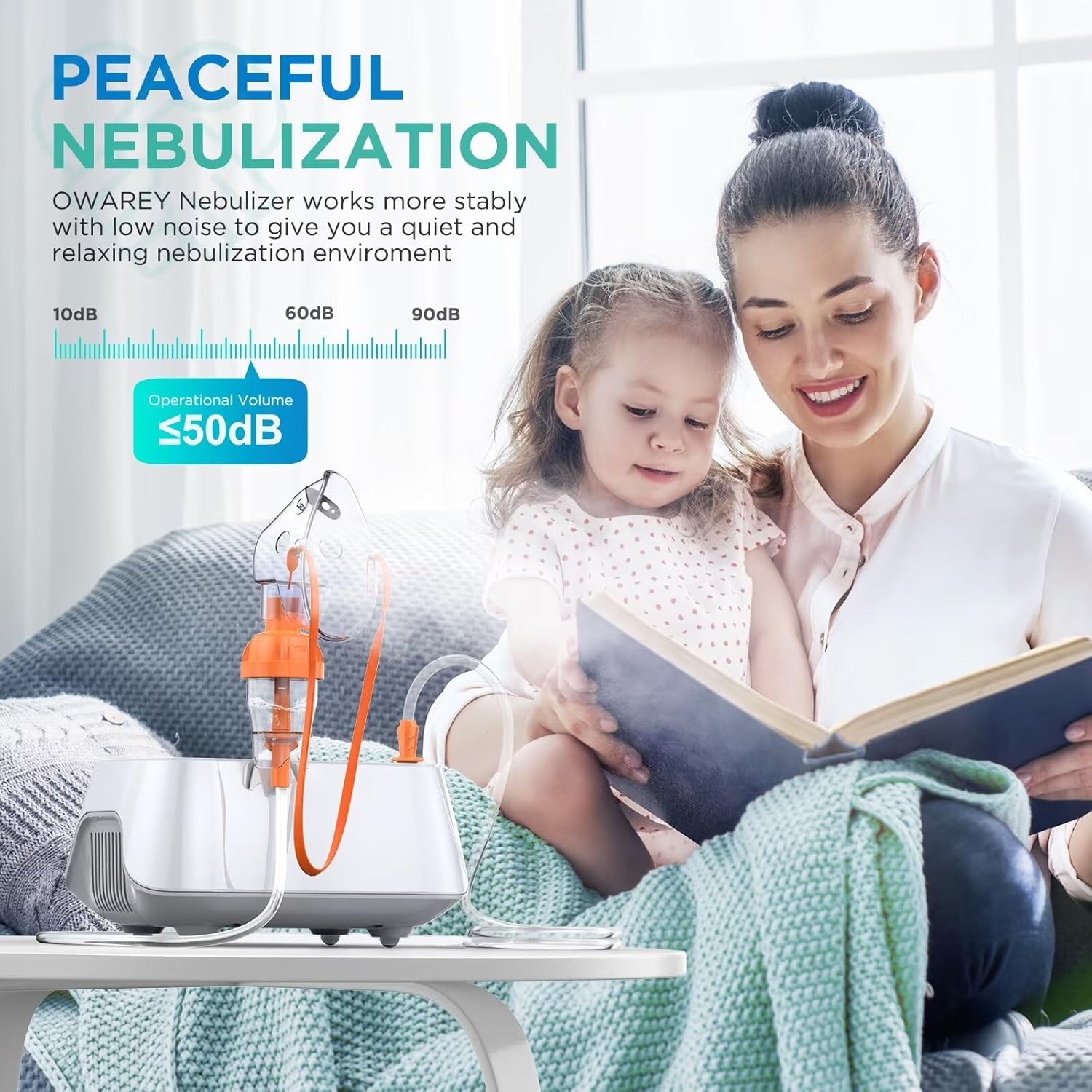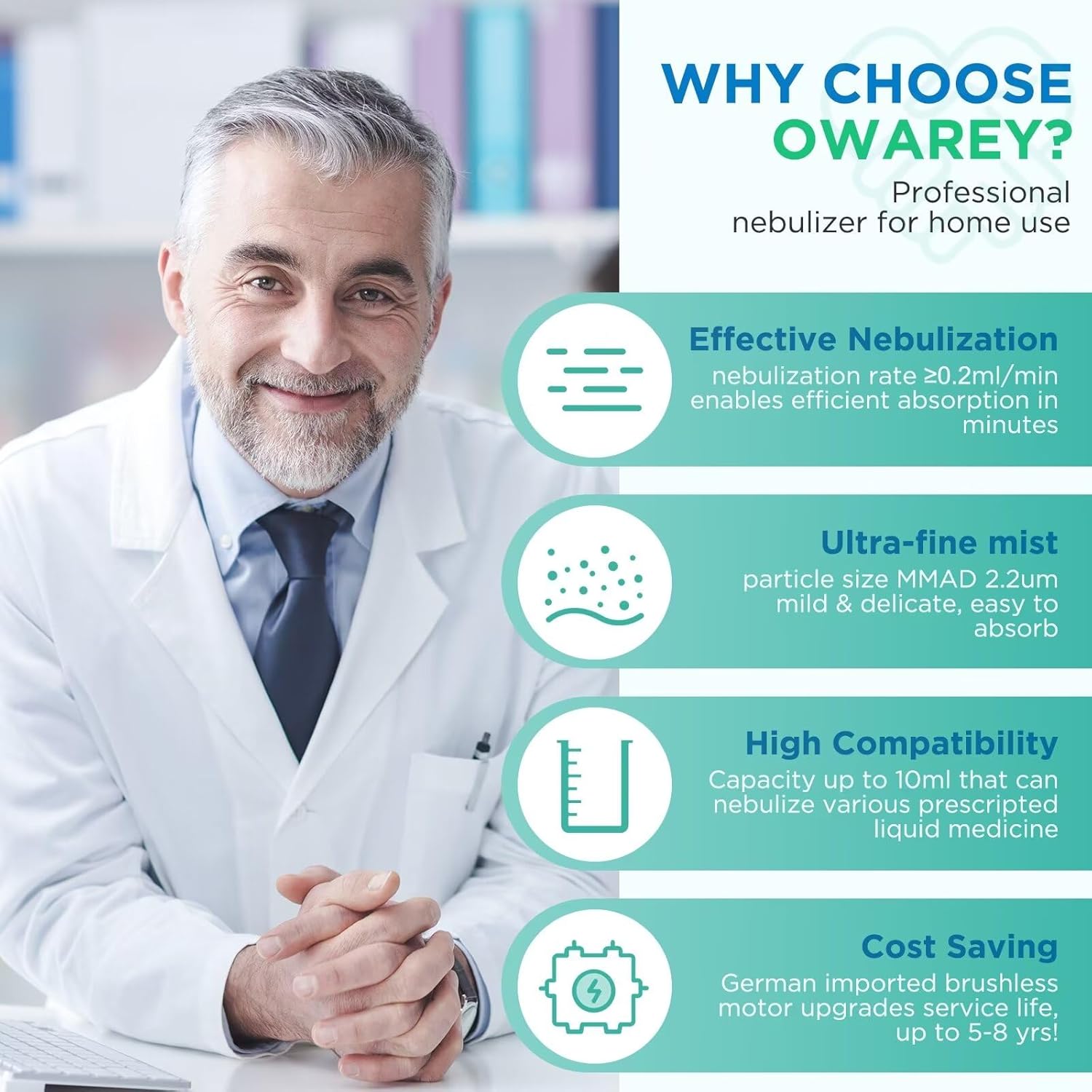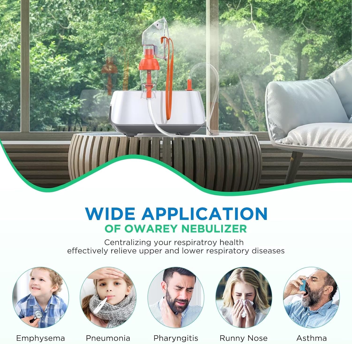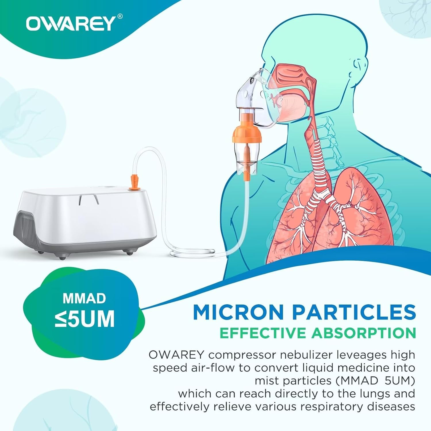 [Rapid Relief In Minutes] OWAREY compressor nebulizer machine produce more stable, finer mist in a continuous manner (MMAD<5μm). 85% of particle diameter is measured below 5μm that can penetrate directly to the affected tissues, enabling better absorption and effectively treating various respiratory diseases.