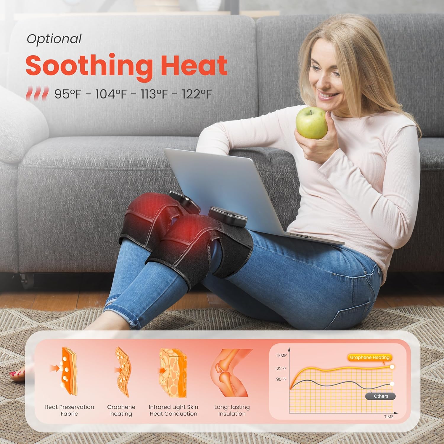 Soothing Graphene Heating: The COMFIER heated knee massager harnesses graphene technology, providing four levels of heating (95°F, 104°F, 113°F, 122°F). Graphene’s exceptional thermal conductivity and rapid heating properties, combined with plush fabric, enable deep penetration into the skin.