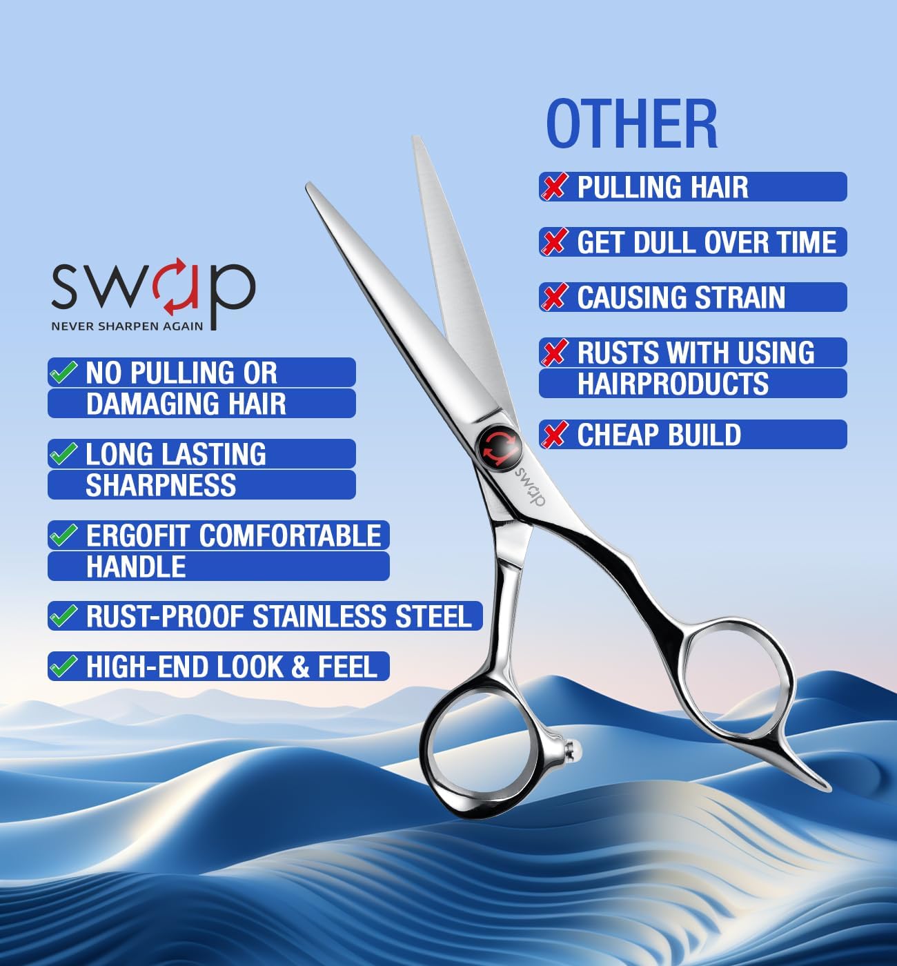 Professional, ultra-fine, extremely sharp blades: SWAP professional barber scissors are designed by Japanese designers and finely polished by a factory with 30 years of experience in big brand production. Barber scissors have extremely sharp blades, a mirror-like, high-quality appearance, and sturdy and long-lasting quality!