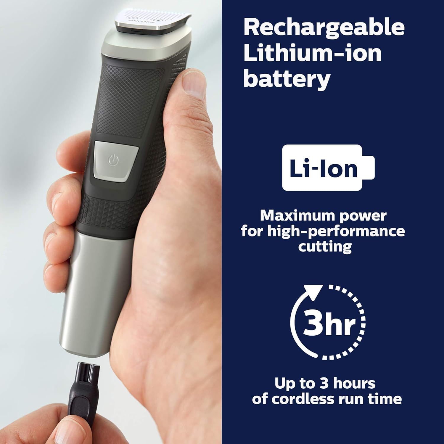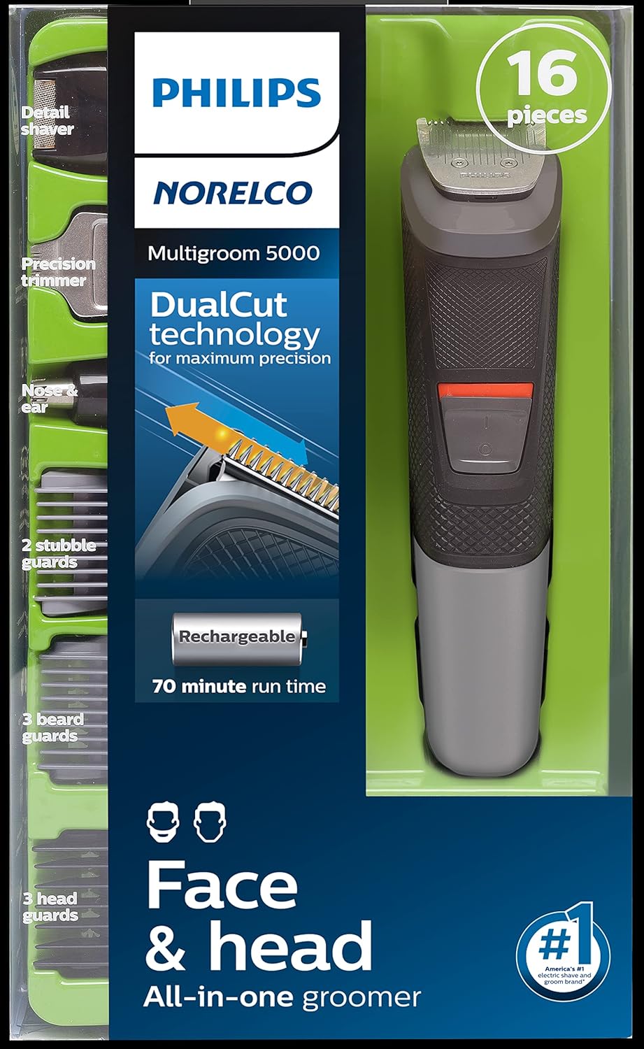 The Philips Norelco Multigroom 5000 offers exceptional value for your grooming needs. With tempered steel cutting blades that self-sharpen and won’t rust, this durable trimmer includes impact-resistant cutting guards, a steel reinforced motor, and a powerful lithium-ion rechargeable battery delivering up to 3 hours of run time. The blades and guards can be rinsed clean, and the device comes with a 45 day risk-free trial and a full 2-year warranty. Not for use in the shower. The trimmer includes 18 pieces to trim your face, head and body hair. Contents include steel trimmer, steel Detailer, nose and ear Trimmer, extra-wide hair trimmer, 3 Beard trimming guards, 2 stubble trimming guards, 6 hair trimming guards, 2 Body trimming guards, accessory travel storage bag, and cleaning brush.