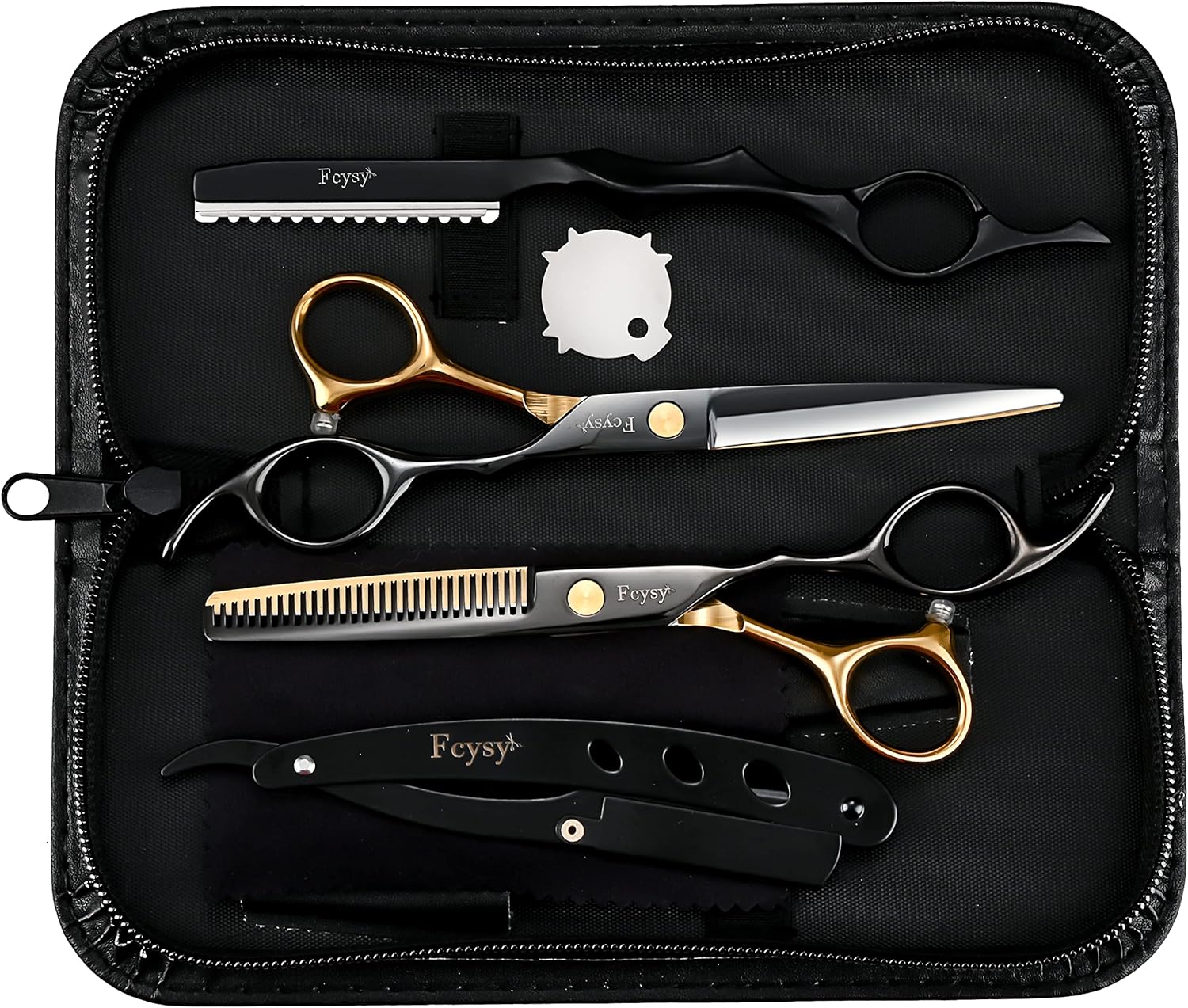 💇:PROFESSIONAL HAIR SHEARS SET: With a length of 6 inches, and safe smooth blade top design. Fcysy haircut scissors is safe and easy to use on men, women, the elderly, children, and dogs! With a sleek stainless-steel texture, our scissor reduces messy hair clutters as no hair gets caught in between its thinning blades, unlike other hair thinning scissors on the market.