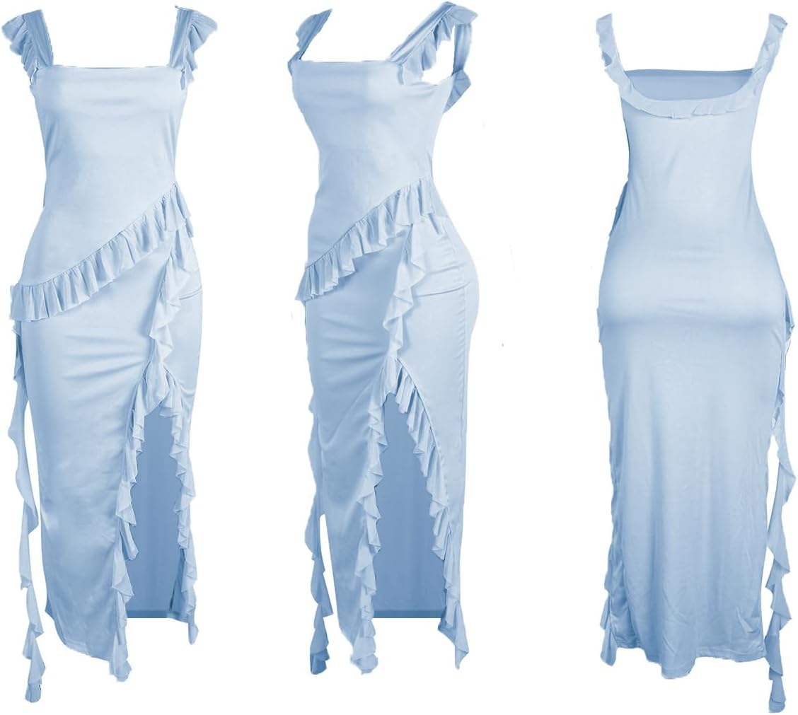 Feature:Spaghetti strap, sleeveless, square neck, ruffle stitching, sleeveless, ruched, bodycon slim fitted maxi dress, one side sexy thigh high slit maxi dress, floral red blue wedding guest dress.