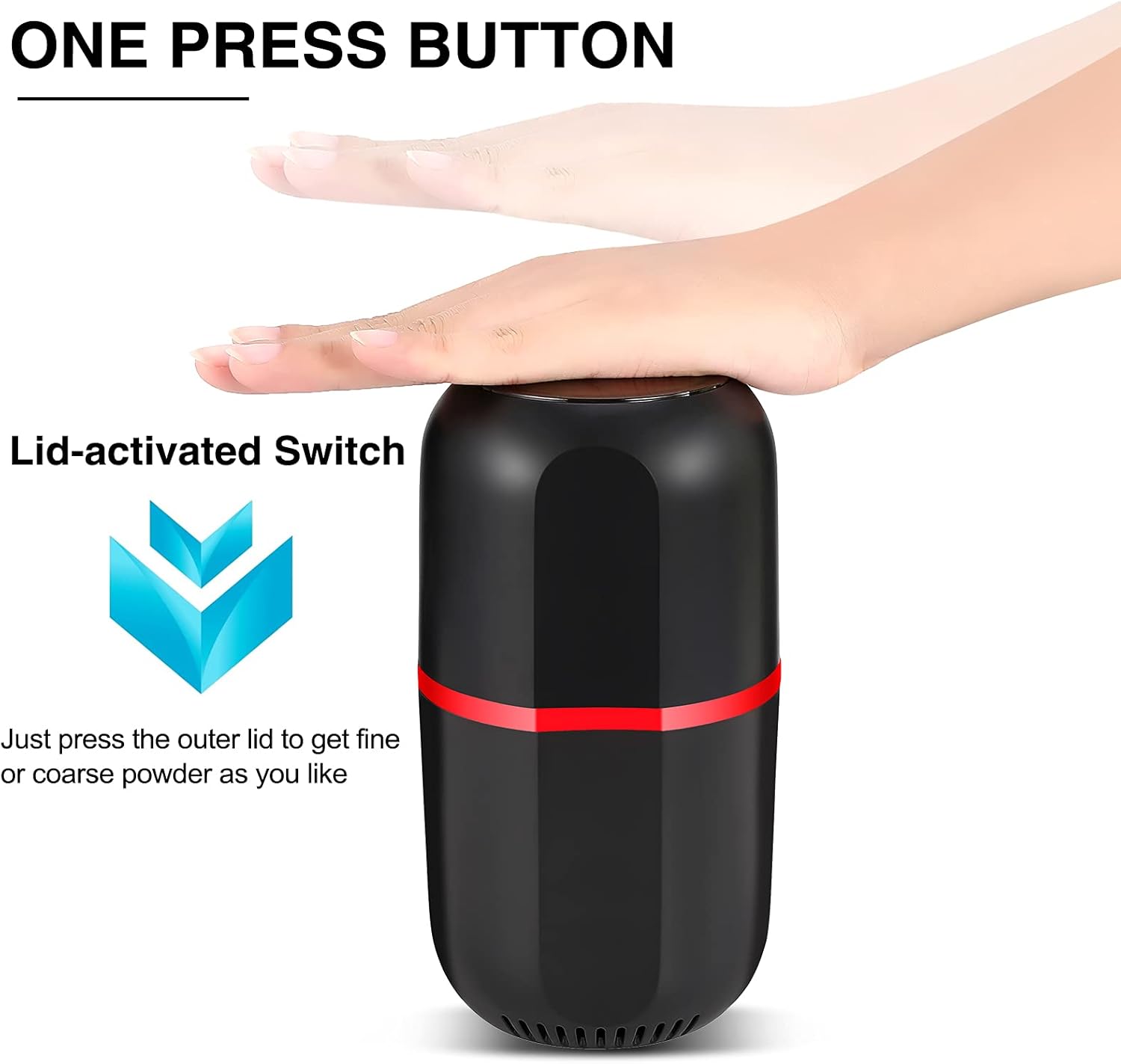 ONE-BUTTON OPERATION AND EASY TO USE: Its design includes a simple push-down-power operation, and the lid is used as a switch; Just a gentle press, the grinder will start grinding, and only stop till you lift your hand from the lid. You can also keep pressing the lid within different time length so as to control the coarse, medium and fine grinding state. In addition, it makes the grinder safer, since the blade will only start to rotate when the lid is on the cup and pressed down.