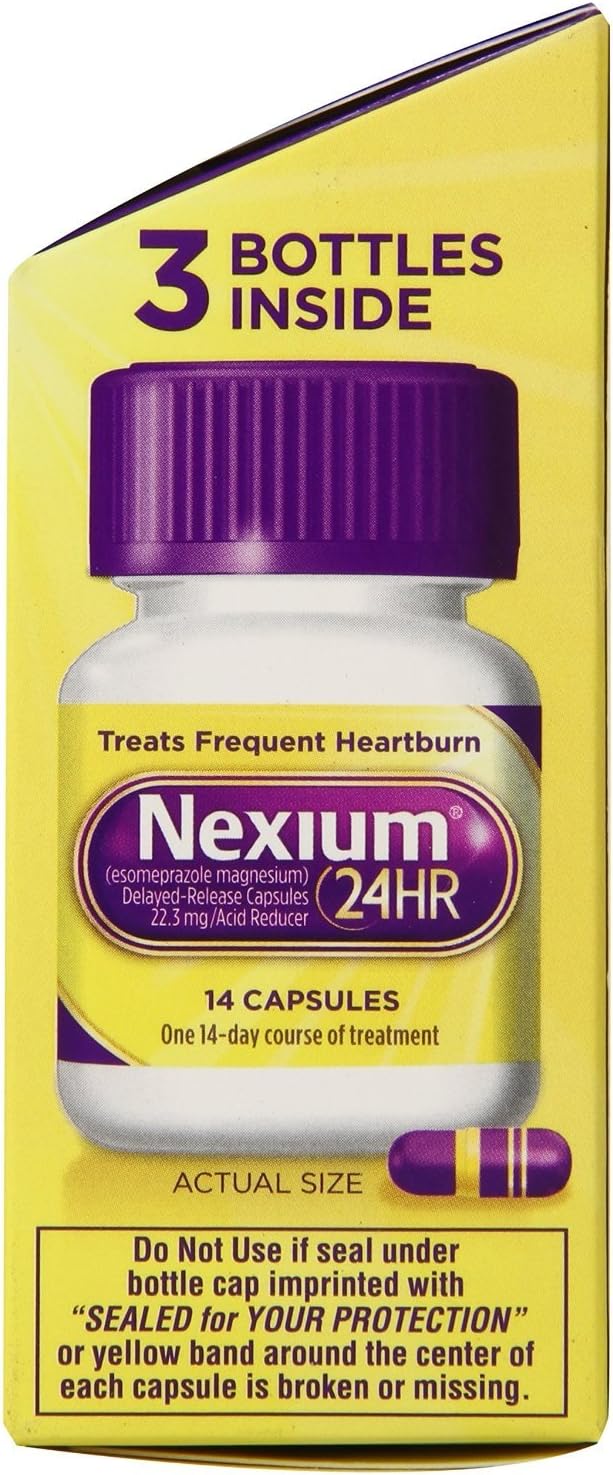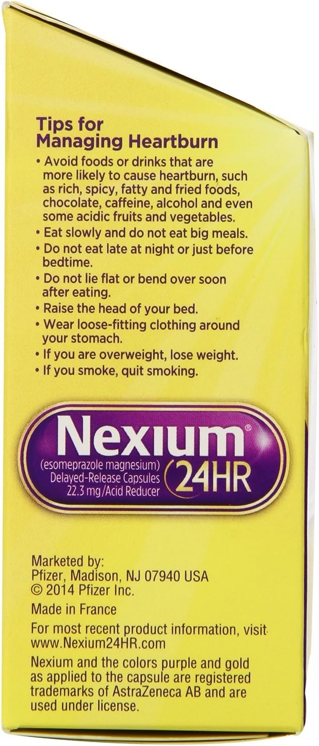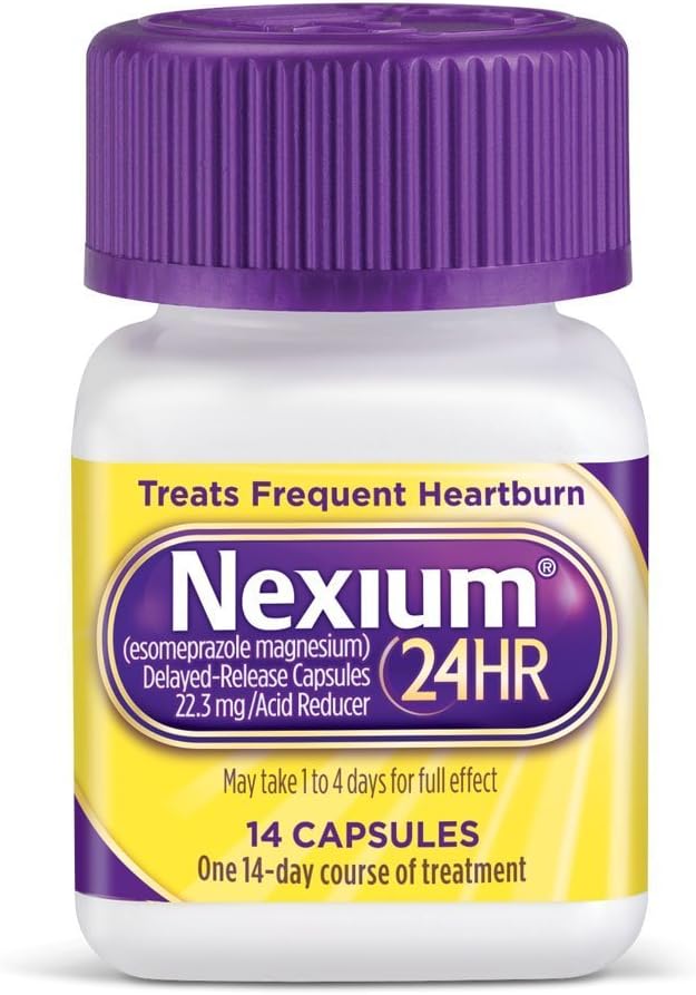 Nexium 24HR Capsules, 126 Count Pack (1w64ws) – Nexium 24HR Acid Reducer Heartburn Relief Capsules with Esomeprazole Magnesium block acid directly at the source to provide complete relief from frequent heartburn no matter what triggers it. Just one easy-to-swallow Nexium 24HR capsule a day provides complete all-day, all-night protection from heartburn. Part of a group of medications called proton pump inhibitors (PPIs), Nexium 24HR capsules contain a delayed-release formula with esomeprazole magnesium to block acid at the source, turning your body’s acid pumps from on to off for complete heartburn protection. Like other PPIs, Nexium 24HR acid blocker capsules may take from 1 to 4 days to reach full effect, but relief lasts for 24 hours, letting you power through your day and sleep peacefully through the night without heartburn interruptions. Nexium 24HR is the number 1 selling OTC brand for frequent heartburn and the number 1 choice of doctors for their own frequent heartburn. This package of Nexium capsules contains a 14-day course of treatment in one convenient box. Don’t let heartburn pause the moment. Stop acid before it starts with Nexium 24HR. Instructions: Adults 18 years and older. This product is to be used once a day (every 24 hours), every day for 14 days. May take 1 to 4 days for full effect. 14-Day Course of Treatment: Swallow 1 capsule with a glass of water before eating in the morning. Take every day for 14 days. Do not take more than 1 capsule a day. Swallow whole. Do not crush or chew capsules. Do not use it for more than 14 days unless directed by your doctor. Repeated 14-Day Courses (if needed): You may repeat a 14-day course every 4 months. Do not take for more than 14 days or more often than every 4 months unless directed by a doctor. Children under 18 years of age: ask a doctor before use.