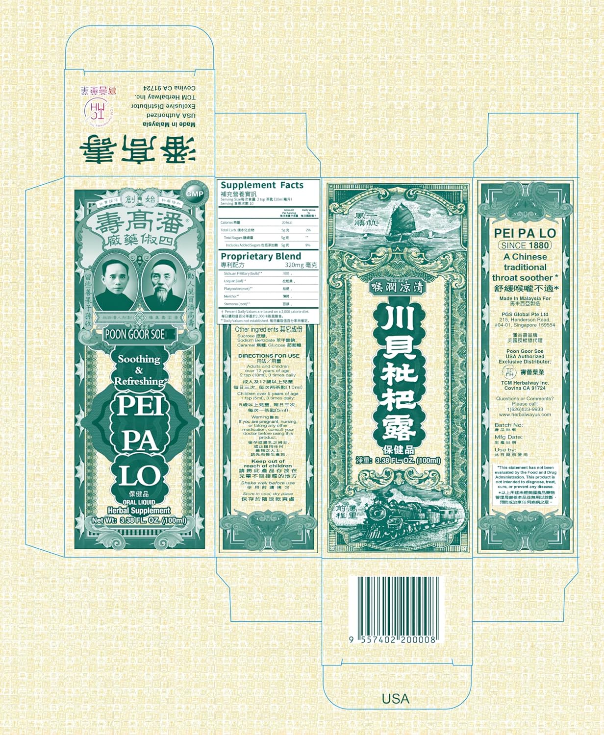 Poon Goor Soe Pei Pa Lo is a herbal supplement with soothing and refreshing properties. Its herbal formula is a proprietary blend dating back to the 19th century.