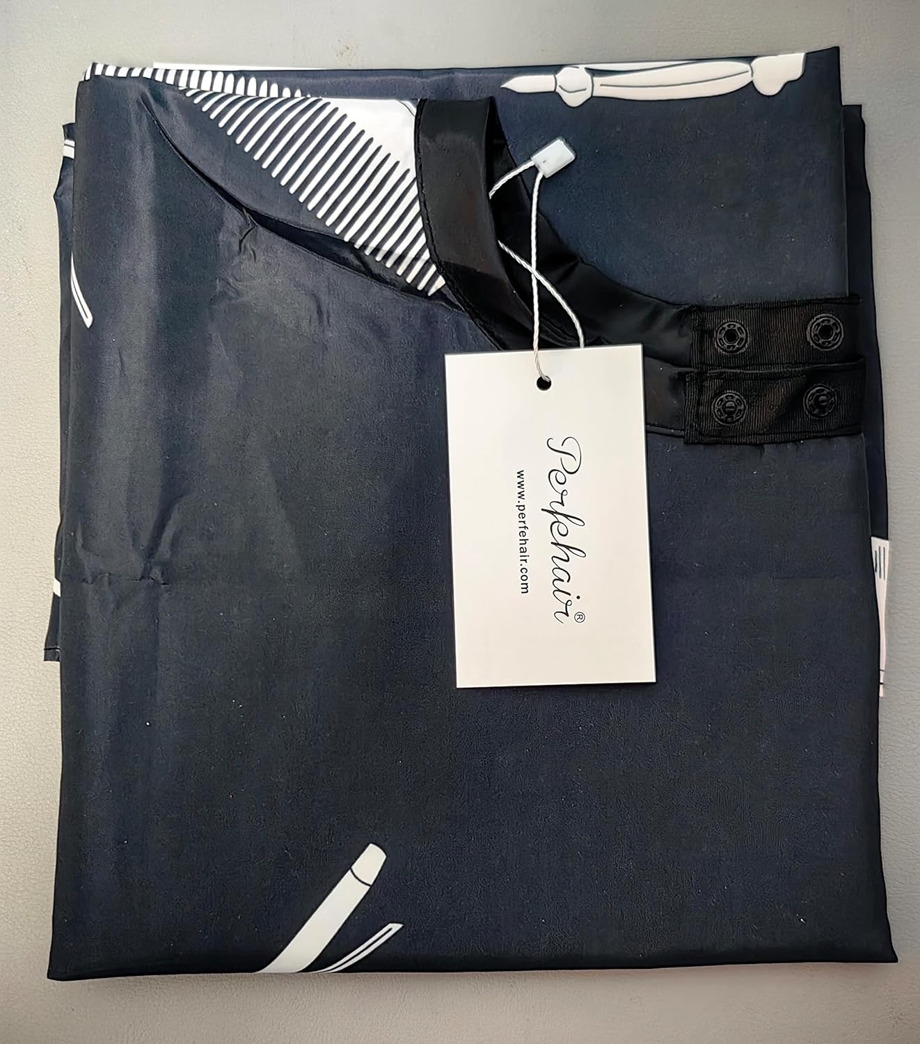 Black barber haircutting cape with special printing, Size: 50″ wide × 57″ long.
