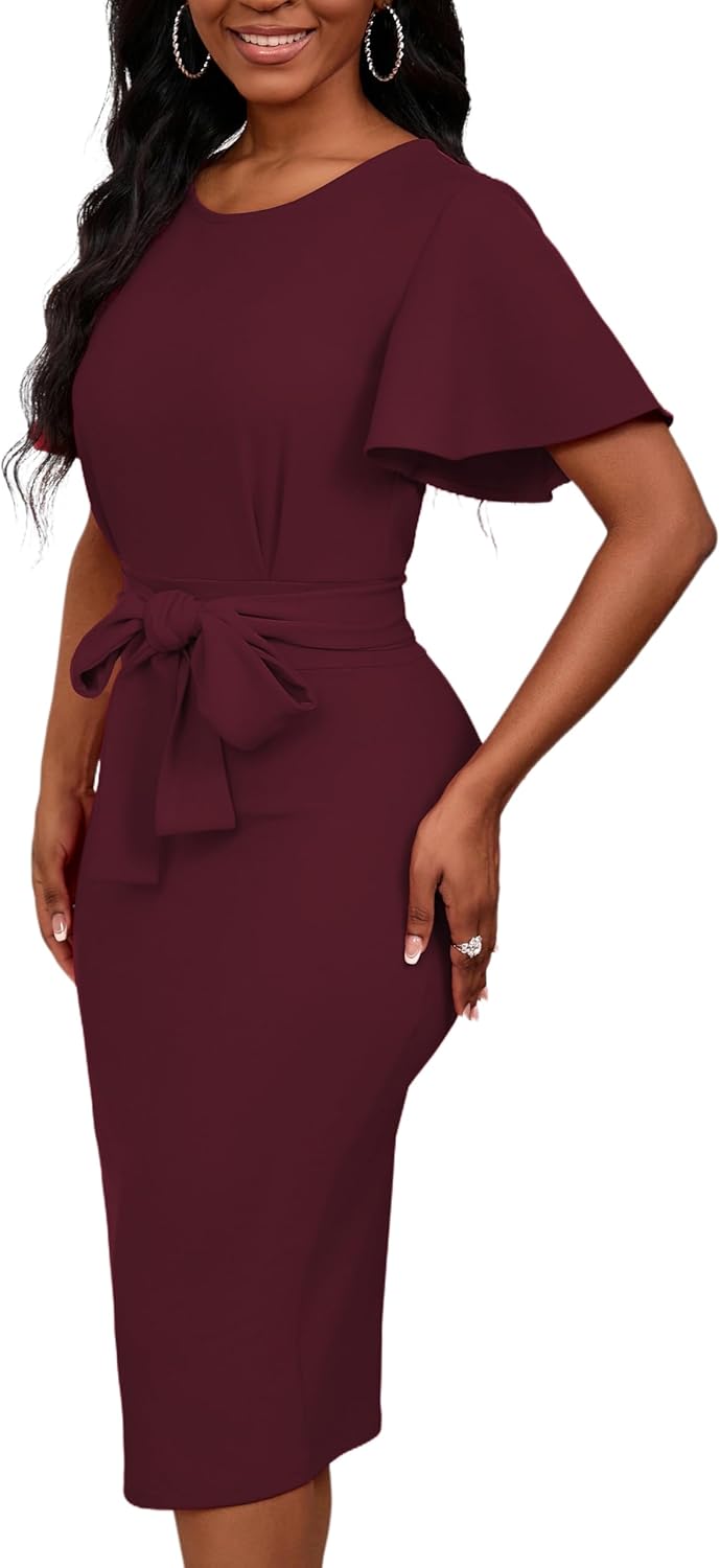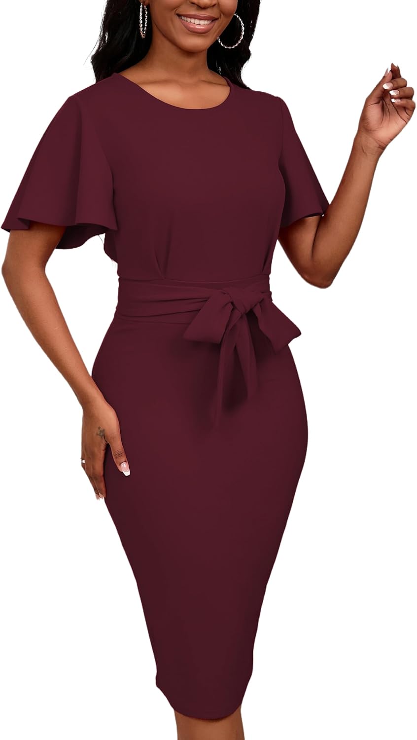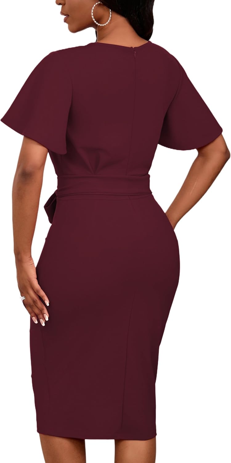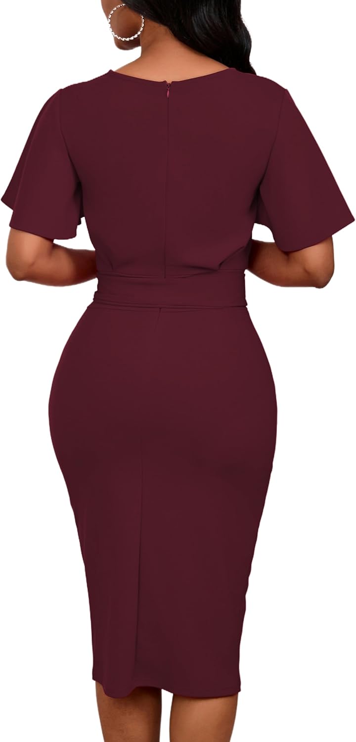 Womens Bodycon Pencil Midi Dress Short Sleeve Ruffle Ruched Cocktail Dress