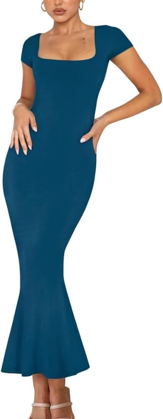 Women’s Summer Maxi Bodycon Dress Square Neck Cap Sleeve Sexy Bodycon Dress