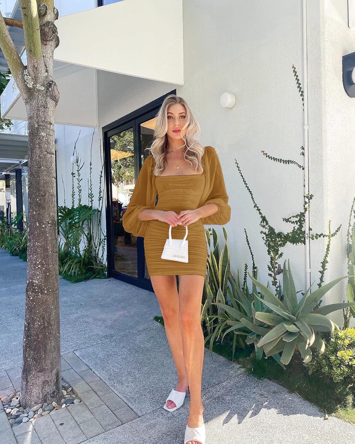 Wenrine Women’s Square Neck Mesh Long Sleeve Club Cocktail Bodycon Mini Dress