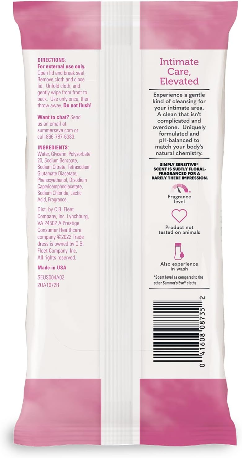 Summer’s Eve Simply Sensitive Daily Gentle Feminine Wipes removes odor-causing bacteria