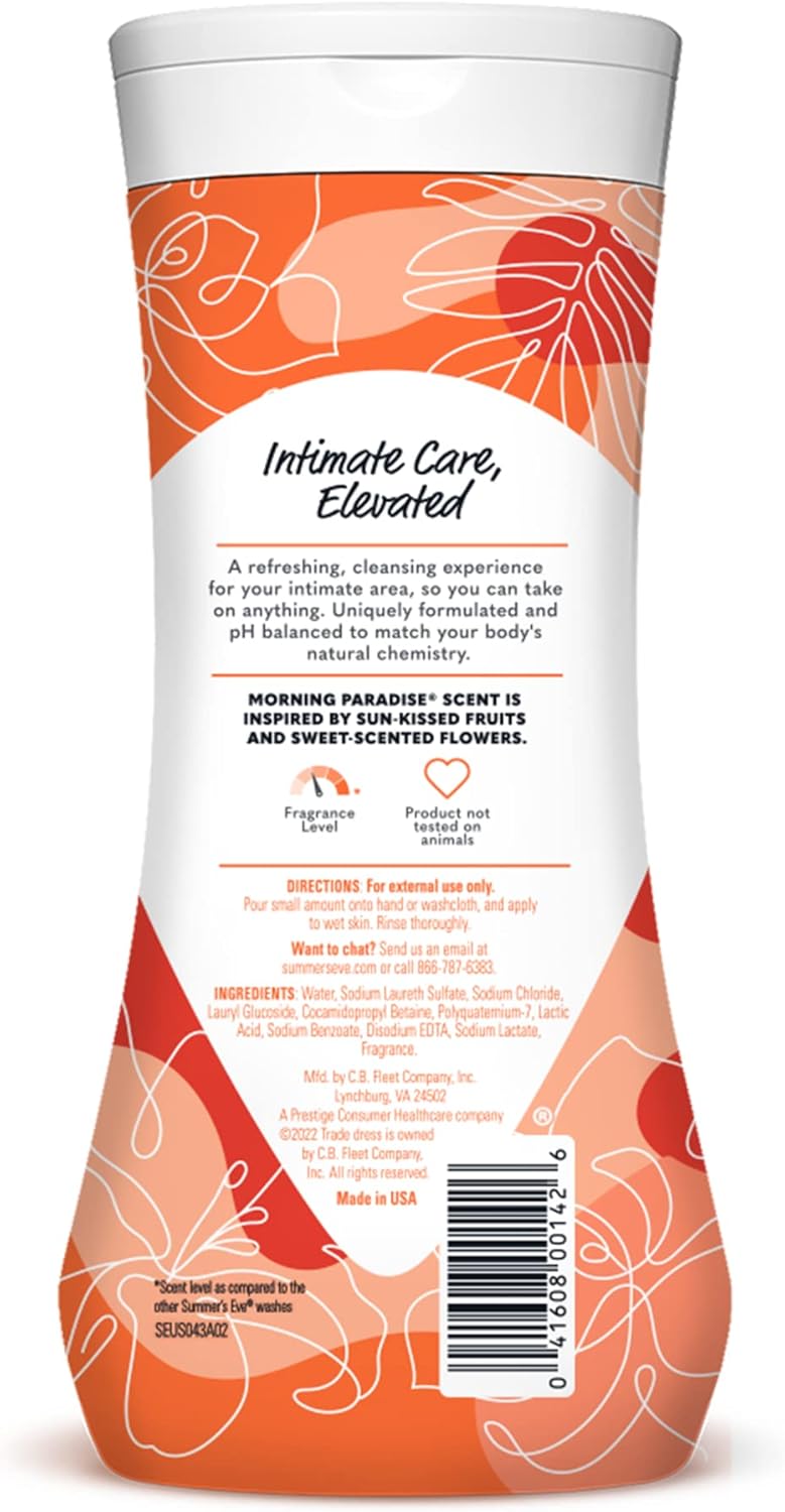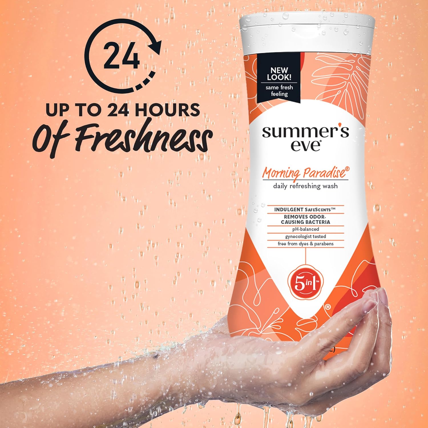 A refreshing, cleansing experience for your intimate area so you can take on anything. Summer’s Eve Refreshing feminine care products comes in a variety of indulgent SafeScents letting you experience that unique, everyday Summer’s Eve readiness. Summer’s Eve Feminine Body Wash is created for your most intimate areas to gently cleanse away the bacteria that can cause odor. Uniquely formulated and pH-balanced to match your body’s natural chemistry. All Summer’s Eve feminine hygiene products, along with every unique scent, are gynecologist tested to ensure they are safe, even for sensitive skin. Morning Paradise indulgent Safe Scent is inspired by sun-kissed fruits and sweet-scented flowers and gentle enough for your most delicate skin. That’s why millions of women trust our expansive range of gynecologist-tested cleansing and care. Our wide variety of products are made for everybody – whether you’re at home or on the go, want to bask in fragrant lusciousness or no scent at all or want ultra-Refreshing or high performance. With every Summer’s Eve product you use, know that We See You, We Get You, We Got You. Sunburn Alert: This product contains an alpha hydroxy acid (AHA) that may increase your skin’s sensitivity to the sun and particularly the possibility of sunburn. Use a sunscreen, wear protective clothing, and limit sun exposure while using this product and for a week afterwards.