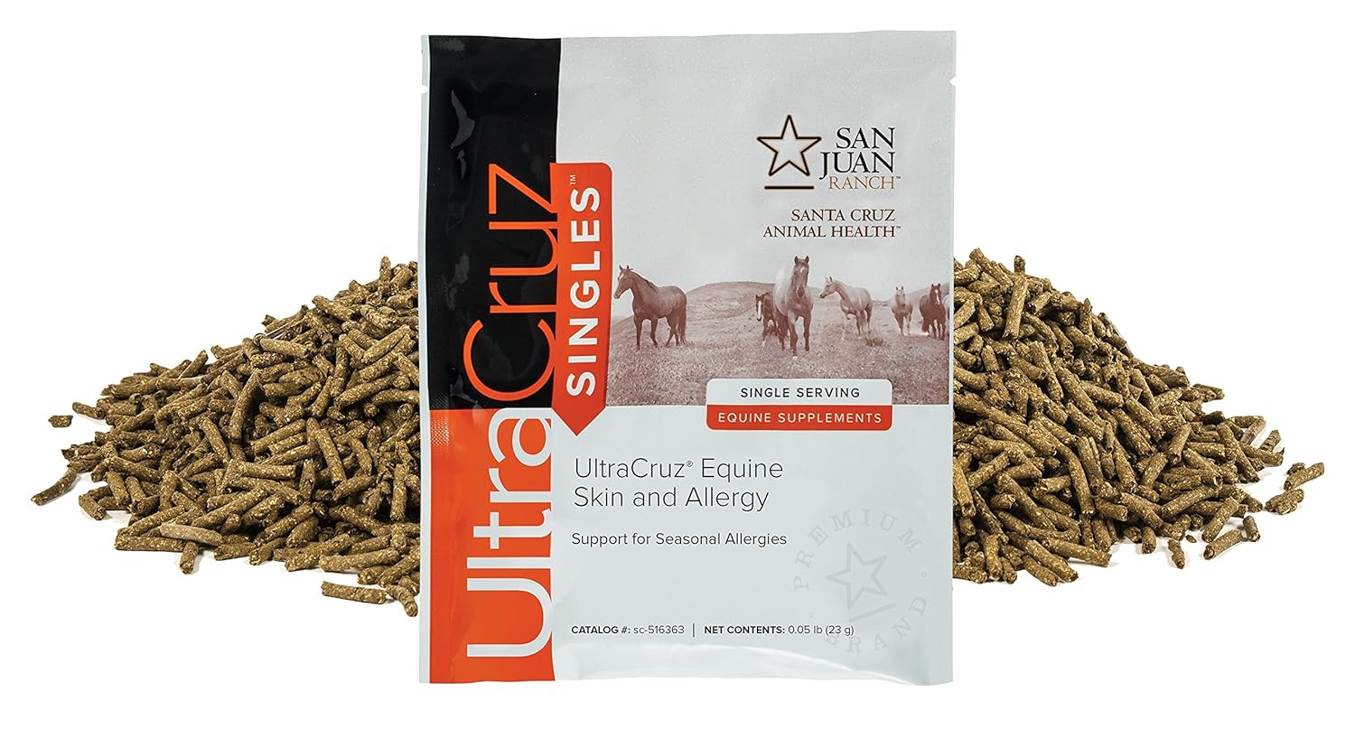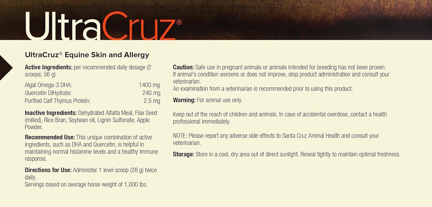 UltraCruz Equine Skin and Allergy Supplement for Horses is a powerful supplement designed to help support horses with seasonal skin allergies. With a potent blend of active ingredients such as Omega-3 DHA (Docosahexaenoic Acid), Calf Thymus extract and Quercetin, this unique formula is helpful in maintaining normal histamine levels.