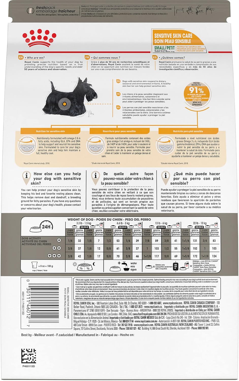 When it comes to your dog’s sensitive skin, you’ve tried it all. Royal Canin knows there’s an exact science to your dog’s skin health, starting with precise nutrition to support a healthy skin and coat. Royal Canin Small Sensitive Skin Care Dry Dog Food is tailored nutrition to support your adult small dog’s sensitive skin and coat. Rich in omega-3 and -6 fatty acids, including EPA & DHA and GLA, this diet helps nourish dry skin and promotes a healthy coat. Plus, 91% of owners saw an improvement in their dog’s skin after two months while feeding Royal Canin Sensitive Skin Care exclusively. Mix this dry food with Royal Canin Sensitive Skin Care Wet Adult Dog Food for a variety of textures to please picky eaters. Also, remember to help protect your dog’s sensitive skin by keeping their bedding and favorite resting places clean. With over 50 years of scientific research and observation, Royal Canin continues to deliver targeted nutrition to feed every pet’s magnificence. Not satisfied? Then neither are we. Our formulas are 100% satisfaction guaranteed. (Just contact us for more details.)