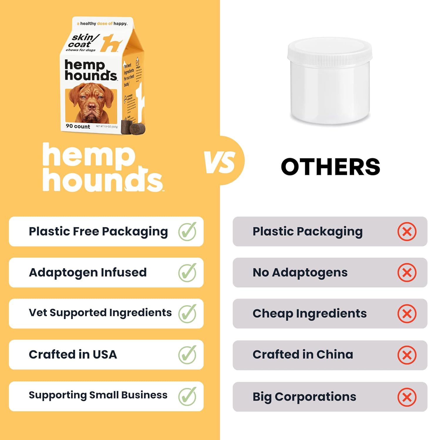 Human Grade Ingredients – Our dog skin and coat supplements are crafted with adaptogneic, herbal, all-natural ingredients such as biotin, omega-3, collagen, Hemp oil, and Norwegian salmon fish oil for dogs. Our dog skin and coat supplements have no artificial preservatives, fillers, corn, soy, palm oil, sugars, or dyes.