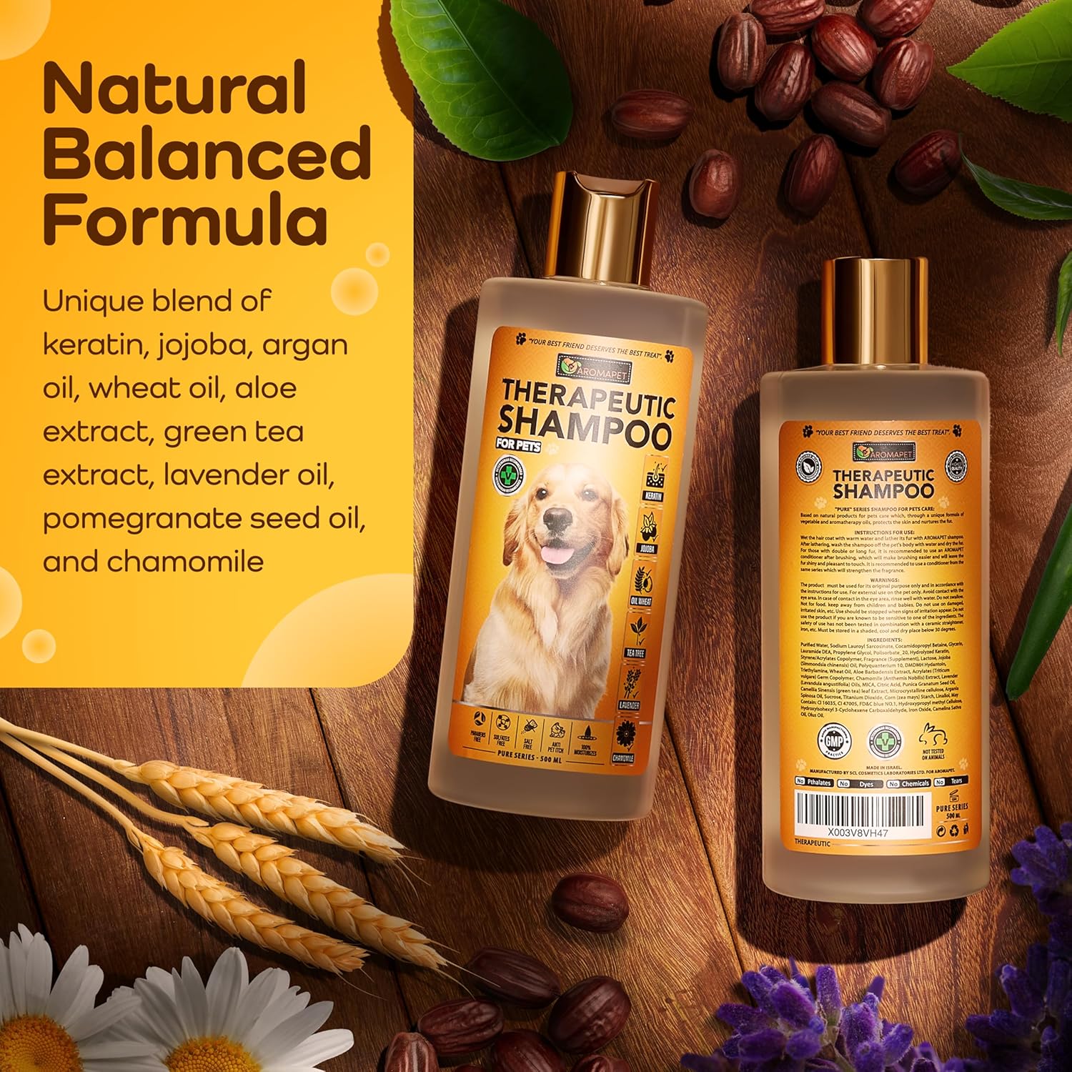 ALL NATURAL DOG SHAMPOO. We stick to natural, non-aggressive pet care, which is why our good smelling dog shampoo incorporates keratin, argan oil, jojoba, aloe and green tea extracts, pomegranate seed and wheat oils, lavender, and chamomile.