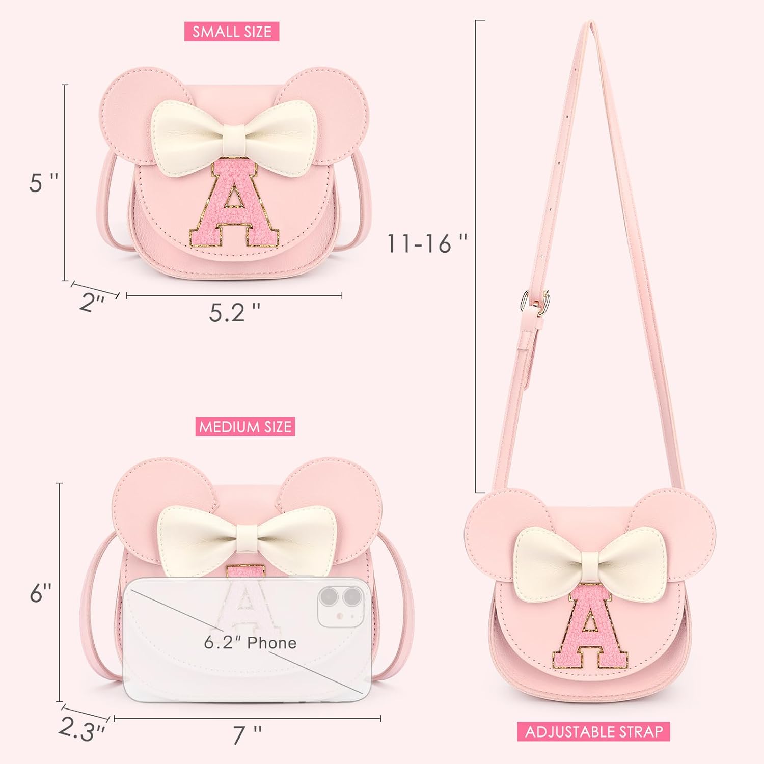 Cute Shape: Patched with a letter,This little girl purse would be a personalized birthday gifts for 6 year old girls or under. Kids would love its mini mouse ears and bow