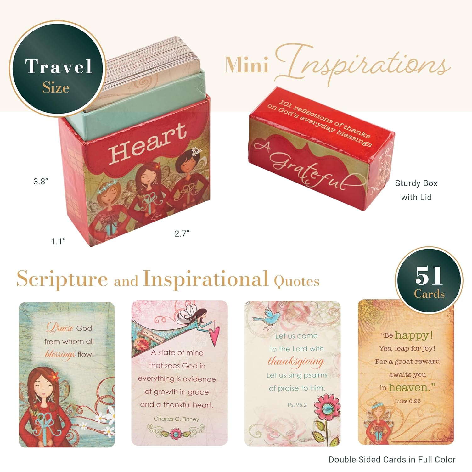 A Grateful Heart The cards in A Grateful Heart Box of Blessings are all printed in full color, double-sided, and feature a combination of Scripture verses and inspiring quotes on both sides. The cards cycle through 5 double-sided designs that include combinations of birds, angels, and flowers, all presented in softly muted tones.
