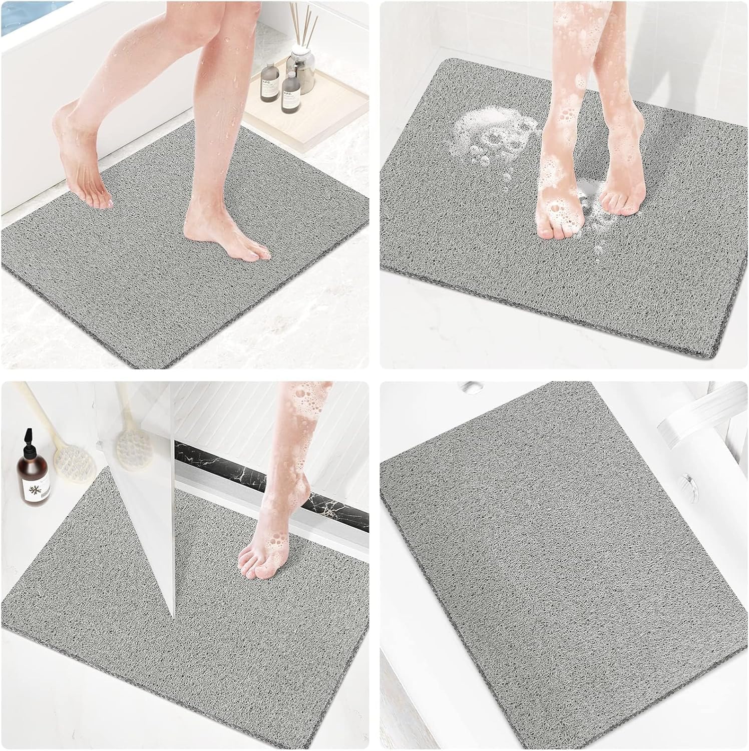 NO SUCTION CUPS: Shower mats without suction cups will protect your textured tub and shower floor surfaces from marks left by suction cups and will be gentle on your feet while you’re standing up in the shower. The non-suction cup shower mat is suitable for many areas, such as bathroom, mud room, and pool side.