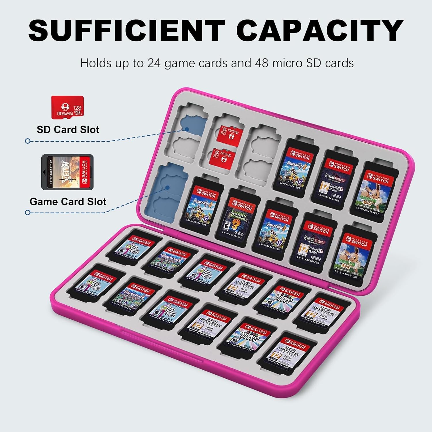 Sufficient Capacity: 24 card slots & 48 micro SD card slots. This compact nintendo switch game case can hold 24 game cards and 48 micro SD cards for Nintendo Switch 2, Switch OLED, Switch, Switch Lite game cards.