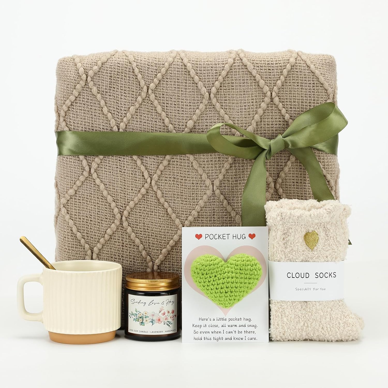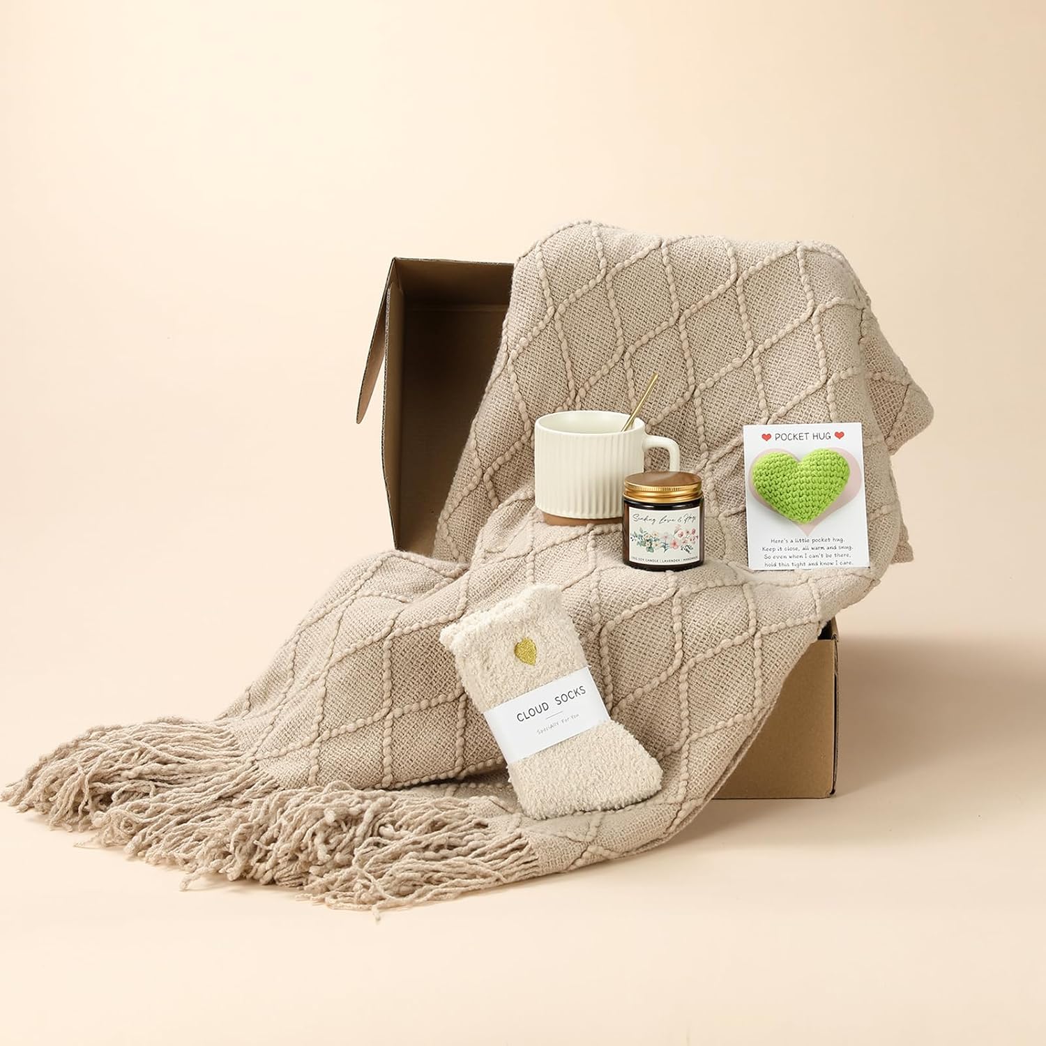 【PREMIUM SELF CARE GIFT BOX FOR WOMEN – 8PCS LUXURY WELLNESS SET】:Thoughtfully curated 8-piece gift box includes: 50″x70″ knitted tassel blanket, fuzzy socks, ceramic mug, handwoven hearts, metal spoon, soy wax candle, personalized gift card, and elegant gift box. Perfect for comforting loved ones during illness, surgery recovery, or stressful times.