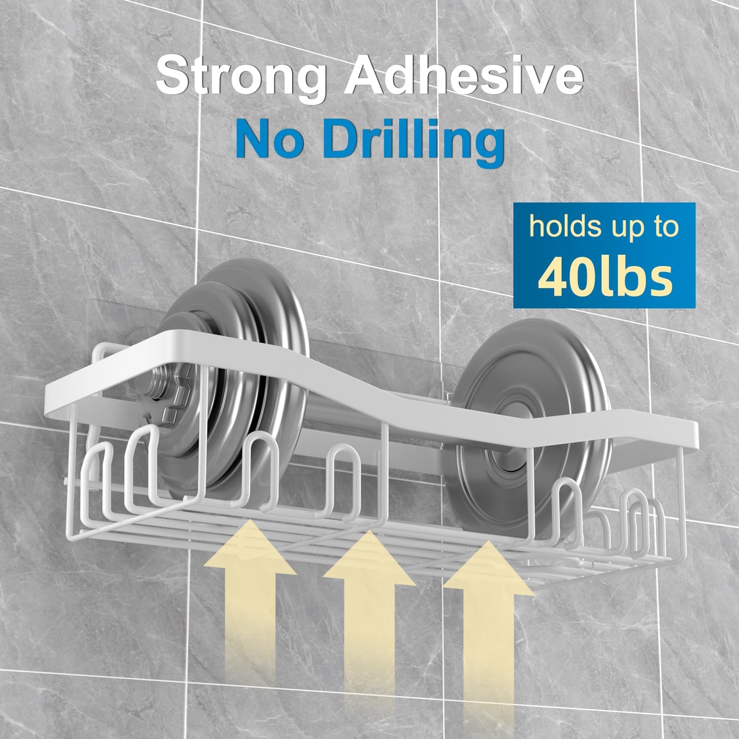 【Strong Load-bearing】:Our Shower Shelf come with ultra-powerful adhesive tapes that can hold up to 40 lb.( Renter friendly Tip: Use a hair dryer to heat it up before tearing it off)