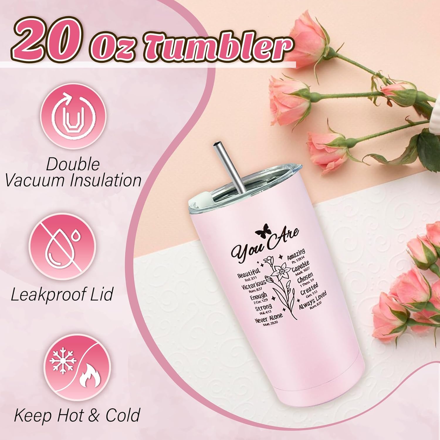 WARM COMPANION FOR FAITH JOURNEY: 20 Oz tumbler in the religious gifts for women with stainless steel straw, whether hot drink or cold drink, this tumbler can maintain the temperature of the drink. The tumbler is painted with an elegant lily pattern, engraved with words from the Bible like God’s gentle advice. For Christian believers, catholic gifts women is not only a container for drinks, but also a faithful companion in the journey of faith.