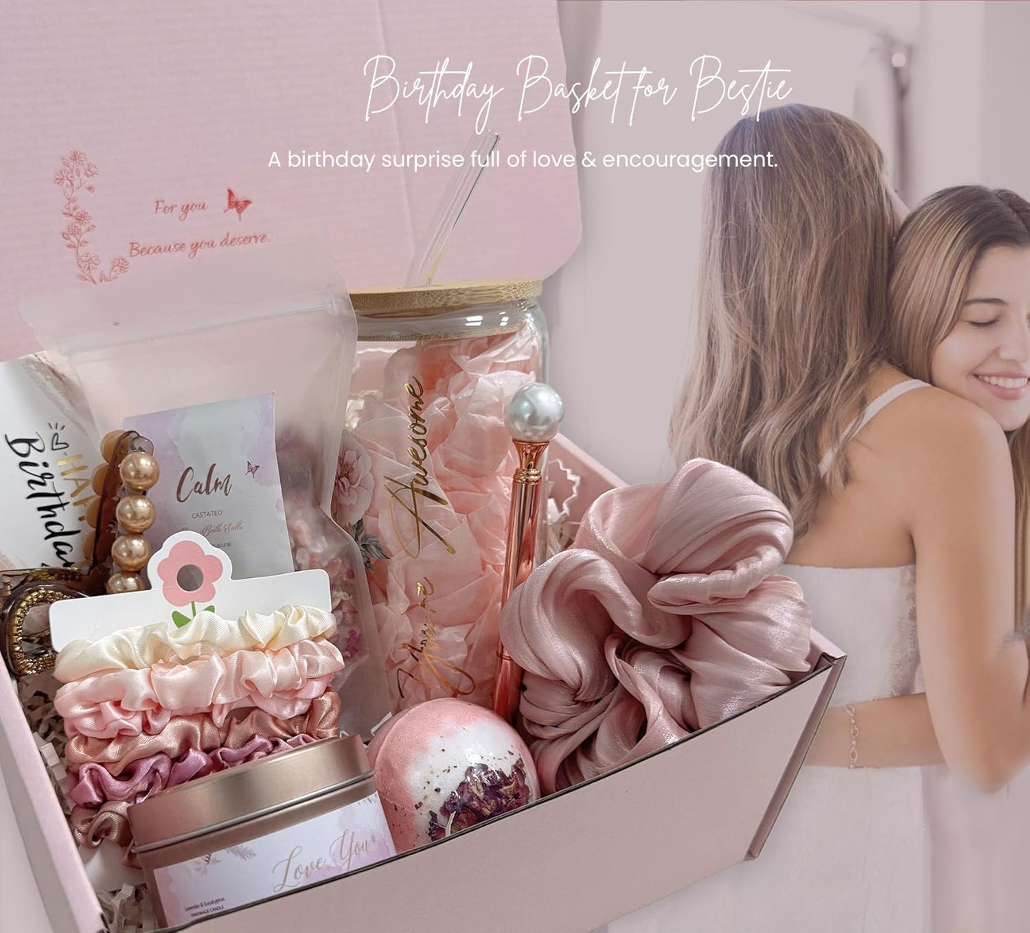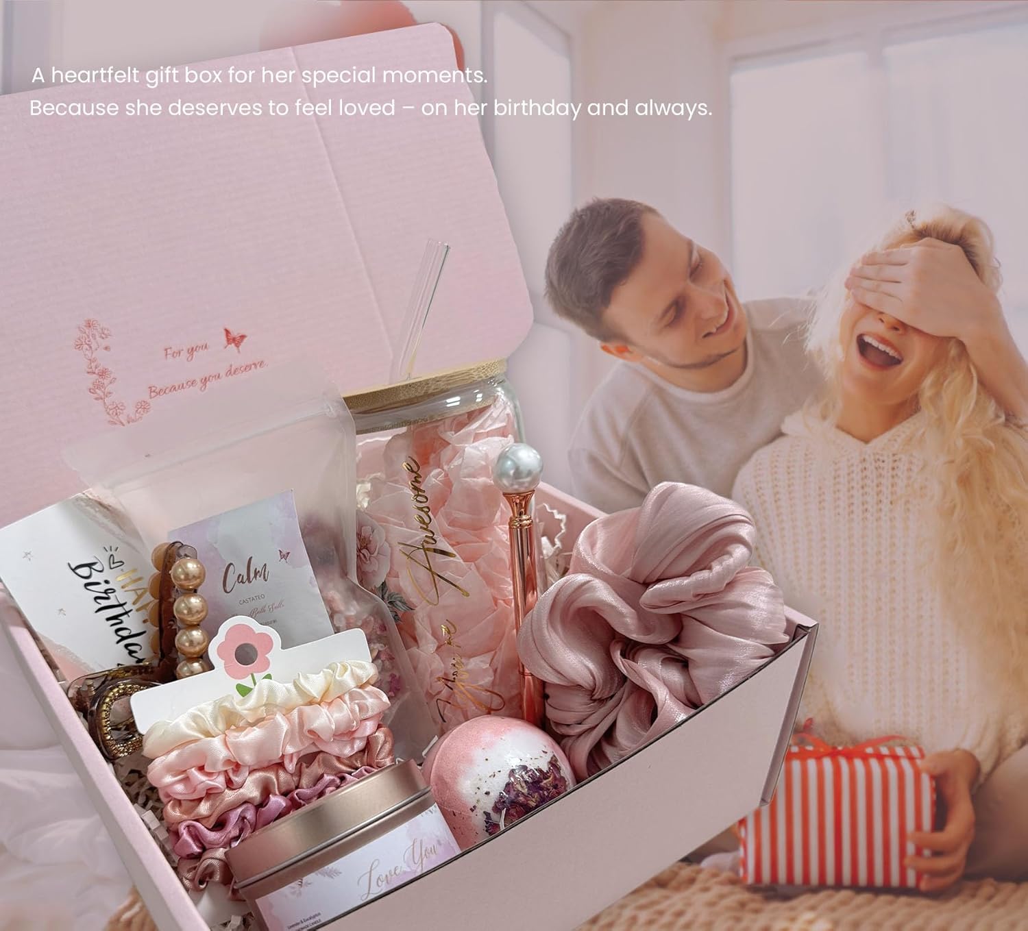 Luxury Pink Gift Box for Women – Birthday Gift Set for Girls, Wife, Mom, Sister & Best Friends – Includes Silk Sleep Mask, Scented Candle, Notebook, Plush Socks, Scrunchies, Pen & More Product Description: Looking for the perfect gift to surprise a special woman in your life? This beautifully curated Luxury Pink Gift Box is designed to bring warmth, relaxation, and joy to any occasion. Whether it’s a birthday, anniversary, Mother’s Day, Valentine’s Day, or Christmas, this thoughtful set includes everything she needs for a cozy and pampering experience. What’s Inside? Silky Sleep Mask – Blocks out light for a restful and rejuvenating sleep. Scented Candle – A soothing aroma to create a relaxing atmosphere. Glass Cup with Bamboo Lid and Straw Elegant Notebook – A stylish journal for notes, thoughts, or creativity. Luxury Pen – Smooth writing with a pearl accent for a touch of elegance. Scrunchies – Beautiful satin hair ties that are gentle on hair. Crochet Plush Keychain – A cute and unique accessory for everyday charm. Greeting Card – Includes a heartfelt message to make her feel special. All items are beautifully arranged in a premium pink gift box, ready to impress! This is more than just a gift—it’s an unforgettable experience of comfort, elegance, and love. Give the gift of happiness today!