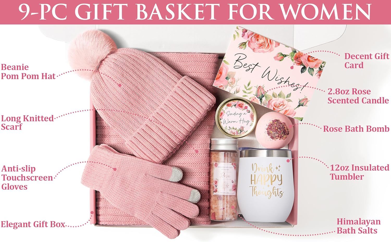 9 PCS CARE PACKAGE FOR WOMEN: MAYICIVO Warm Winter Gifts Self Care Gifts for Women Cozy Gifts Birthday Gifts for Women best friends mom sister wife contains all carefully-designed thoughtful goodies, including a pom pom beanie hat, a pair of gloves, a long neck scarf, 12oz insulated tumbler, 2.8oz scented candle, a tube of Himalayan bath salts, a bath bomb, gift card & elegant gift box. Such a heart-warming Bath Gifts for Women! Send the warm gifts to accompany her through the cold winter
