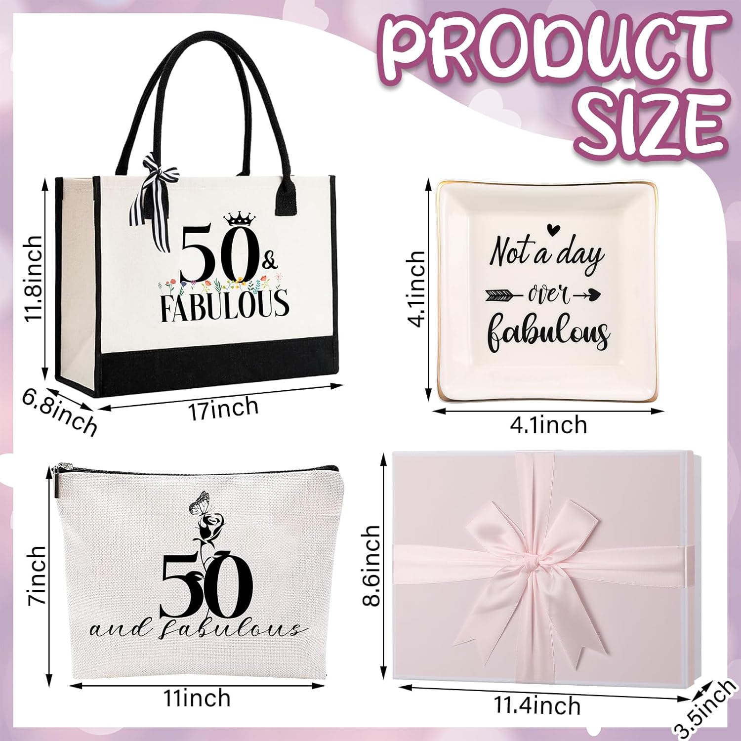 Unforgettable 50th Birthday Gifts for Women: surprise her with the 50th birthday gift set, a sophisticated ensemble of exquisite items designed to make her special day memorable, this gift set contains 1 piece of 50th birthday tote bag, 1 compact makeup bag, 1 elegant wine tumbler, 1 scented candle, 1 ring tray, 1 delightful pair of fuzzy socks, 1 expressive greeting card, 1 exquisite gift box, 1 handy mirror, 1 keychain